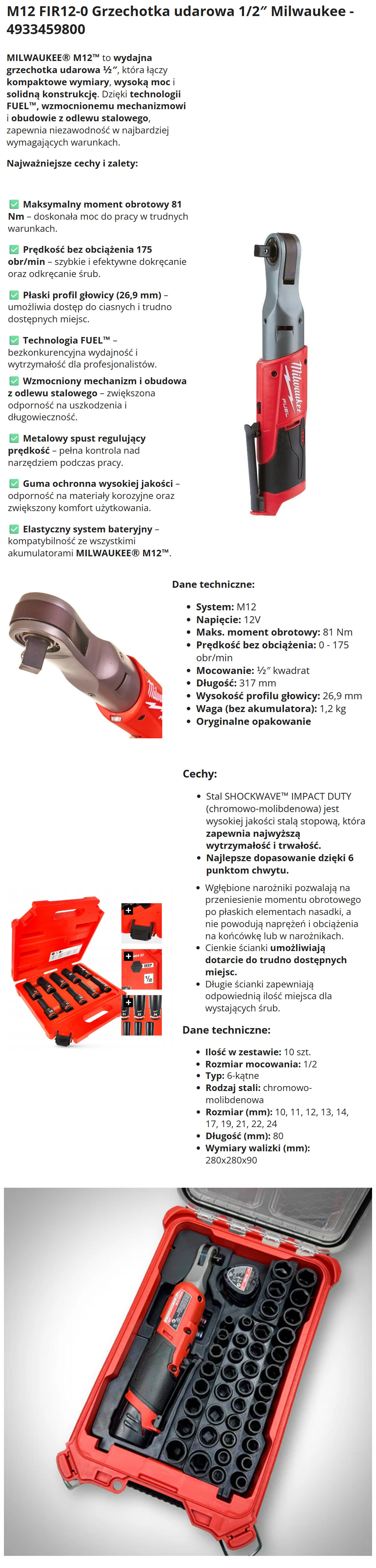 Zestaw: grzechotka wysokoobrotowa Milwaukee M12 FHIR14-0 (4933478171) + zestaw nasadek 8 mm – 19 mm